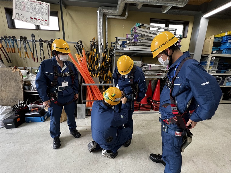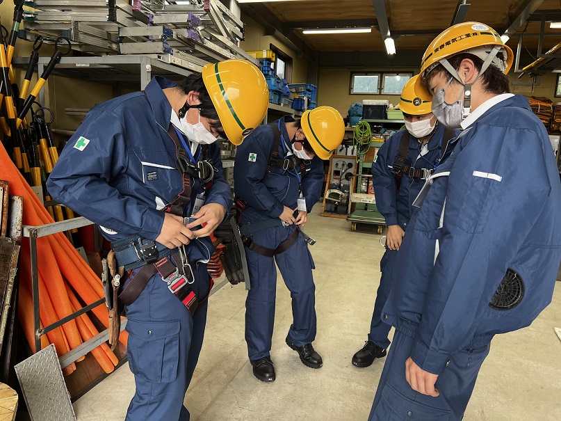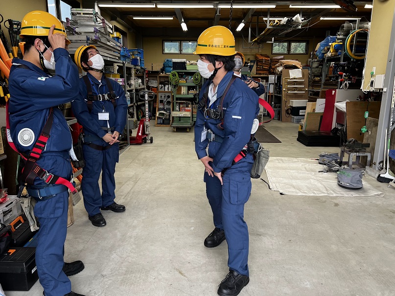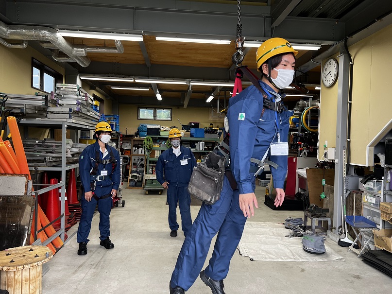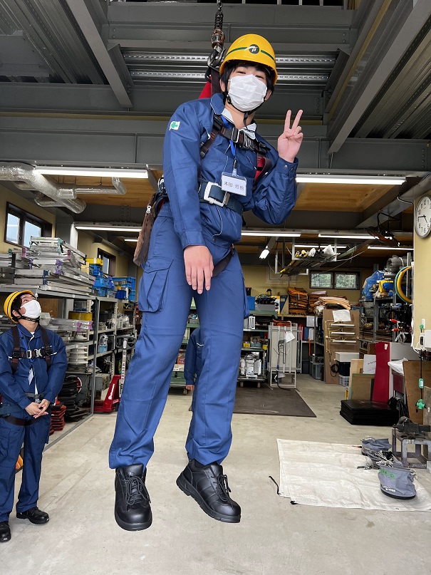 一番大切な「危険予知」を学び「安全帯ぶら下がり体験」「ホイスト体験」です。