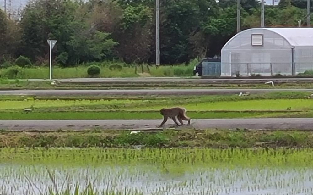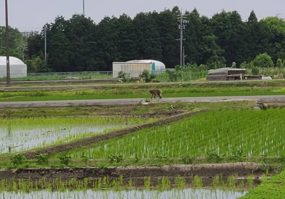 田んぼを走るサルを見て、