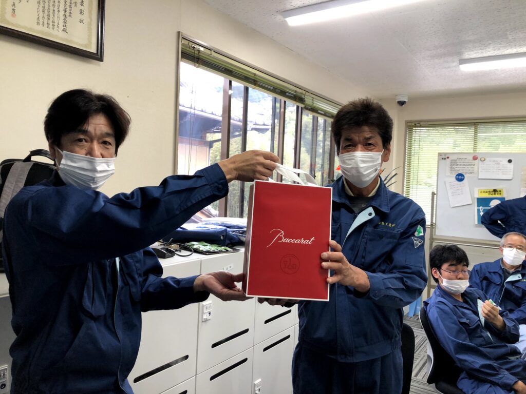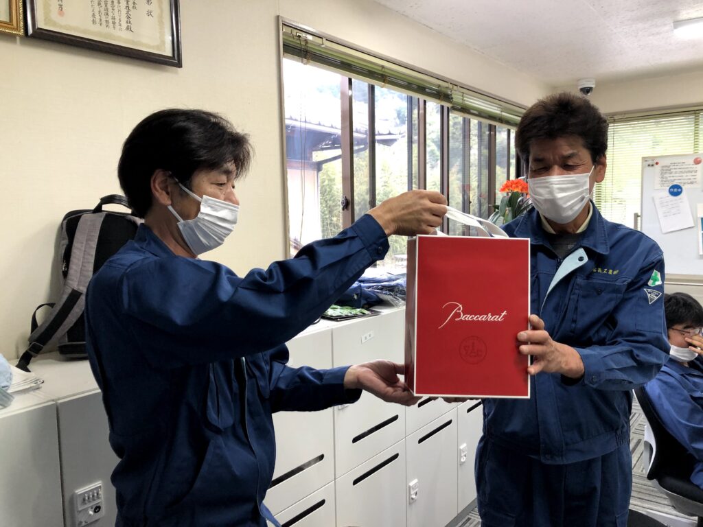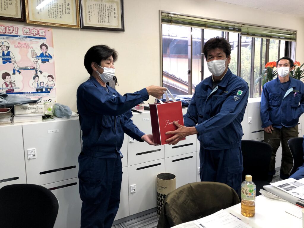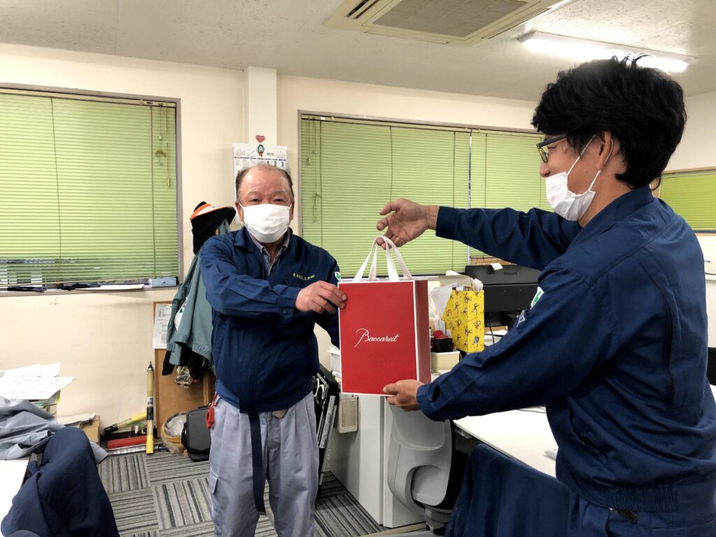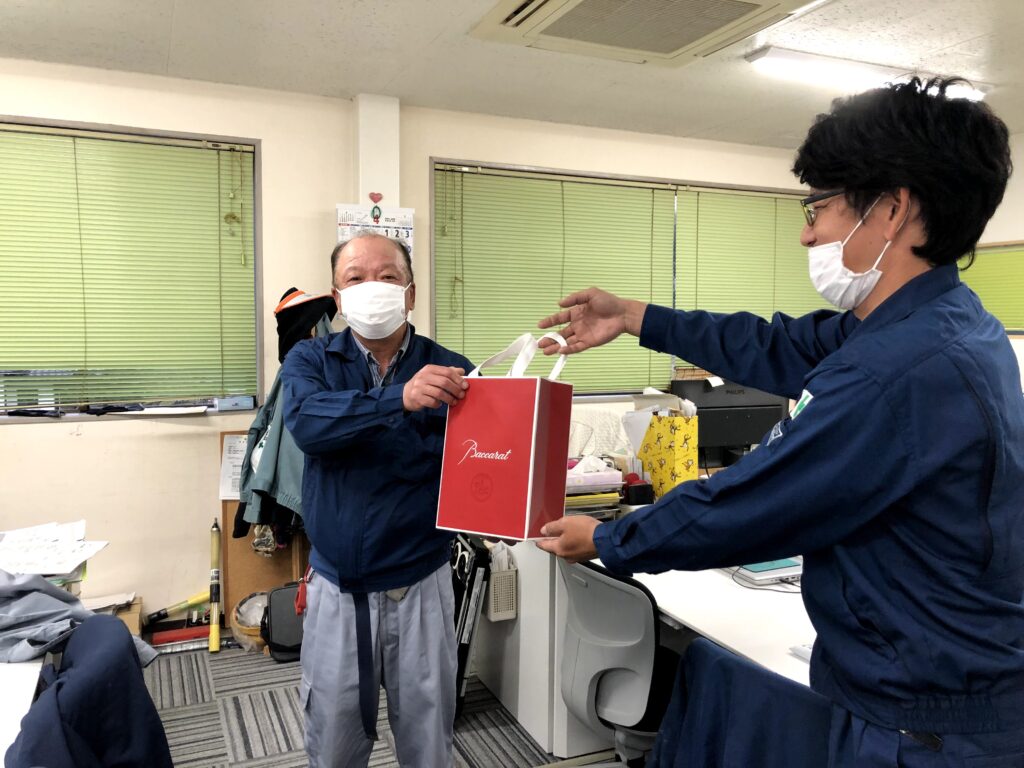 昨年「還暦」を迎えた社員2名に、還暦のお祝いを渡しました。