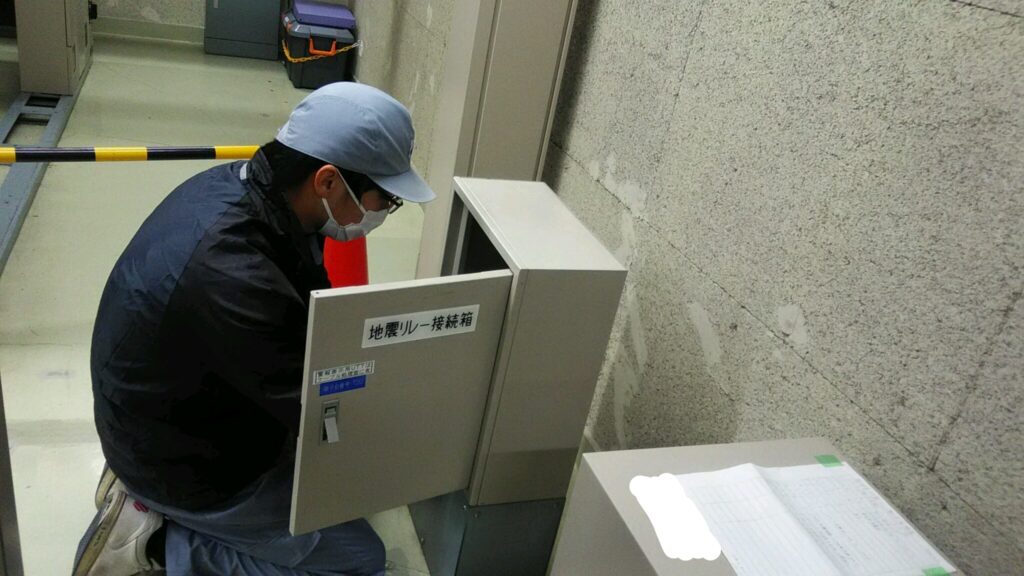 今回は、地震(EQ)Ryの点検をしました。内容としては、Ry内部の清掃・目視点検や電源回路の電圧・絶縁抵抗測定、タイマーの時間測定等を行いました。