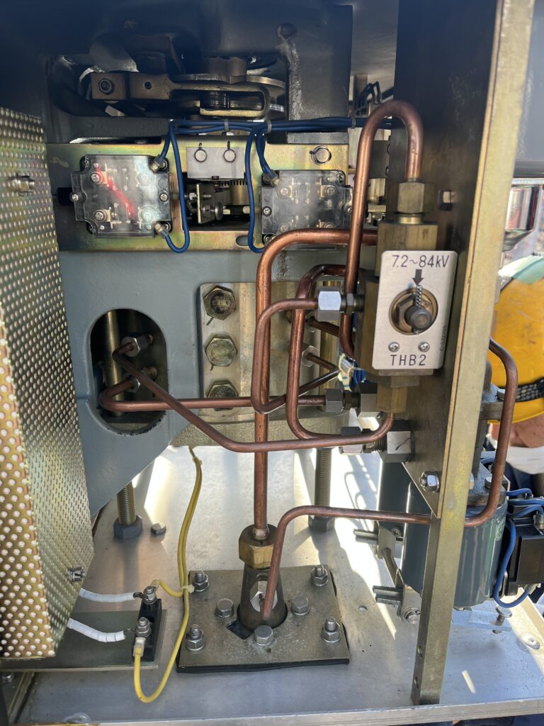 最後に取り付けたところにギュッポフレックス(ガス・空気漏れ検知スプレー)を吹きかけて、空気が抜けてないのが確認出来たら最低動作圧力試験、圧力スイッチ継電器(63)の試験を行い終了です。