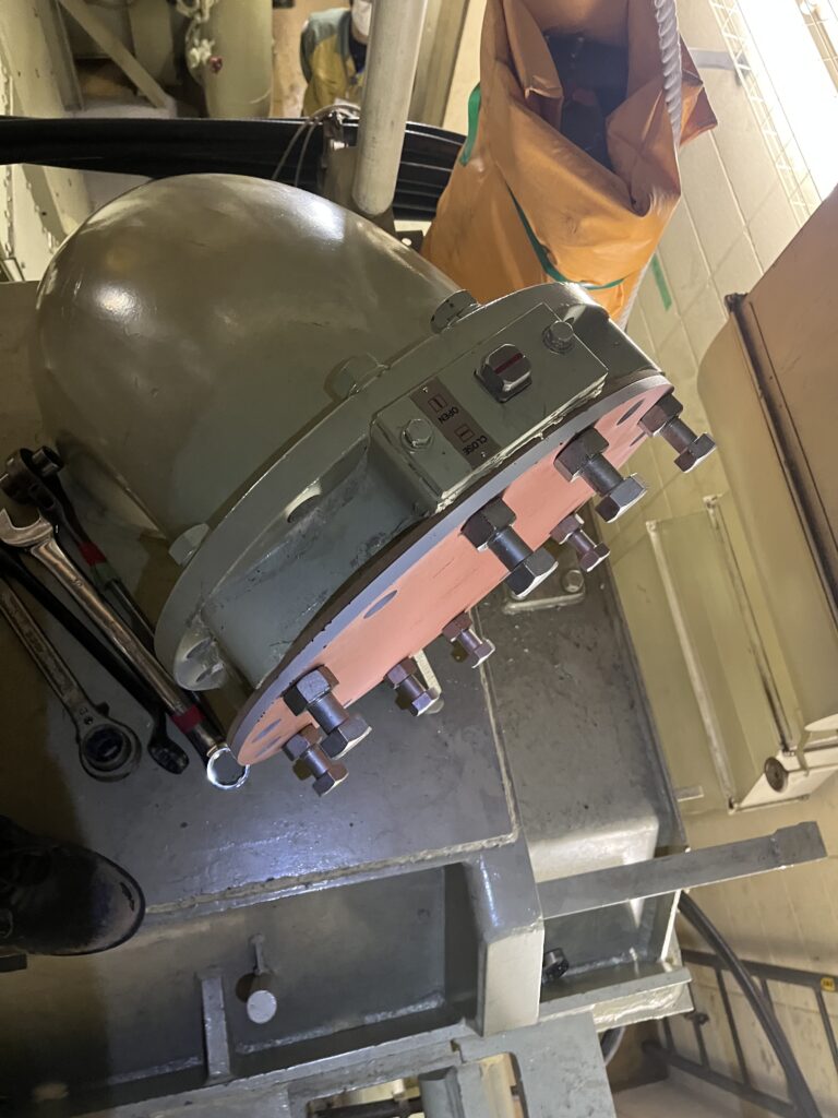 次に本体を取り外していくのでアイマークをかいて、ボルトを外していきます。持ち上げれる手前まできたらチェーンブロックを使用して吊り上げていきます。この時に周囲の機器に当てないように降ろしていきます。