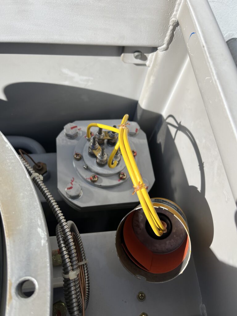 今回は初めて、自分がメインでOFの細点を行いました。まずブリーザーの上部を外します。油を抜く時に開けておかないと、コンサベータ―からブリーザーまではエアーなので下にある油を吸って、ブリーザーの中にあるシリカゲルに油が浸かってしまうため、エアー抜き用で上部を開けます。次に最初と最後に圧力を記録に残すため、油の出入り口を締め、LR側の出入り口が空いていることを確認して、循環させます。終わり次第、油を抜いていきます。この時にタンク側につながっているv5のバルブもある程度抜けたら、あけて出来るだけ中に油が無いようにします。終わり次第ばらし始めます。OFの中にあるヒーターも取り出しますが、OF内にあるヒーターの電源を切ってもACがなくならないことがあるということを聞いたので、テスターでの確認を怠らない様にしたいです。取り付けていくときには、Oリングが挟まらない様に気をつけながら作業したいです。