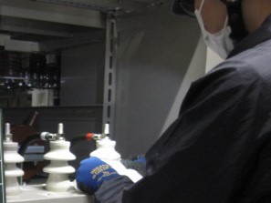 今回はCubが屋内にあったので、粉塵などもあまり被ってなく比較的綺麗でしたので、碍子やケーブル等を重点的にウエスで拭きました。また、碍子にひび割れは無いか、ケーブルに緩みは無いか等も見ながら作業しました。