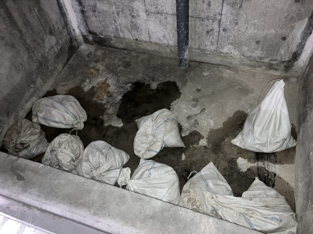 1・2日目は、流れずに溜まっていた水をバケツやちりとりで集めて、排水ポンプがある部屋に流しました。その後、溜まっている泥や砂を箒で集めました。また、硬くなっていて箒で掃けない所もあったので、その様な所はスコップを使って集めました。集めた泥や砂は、土嚢袋に入れて水切りの為に洞道内に置いて終わりました。