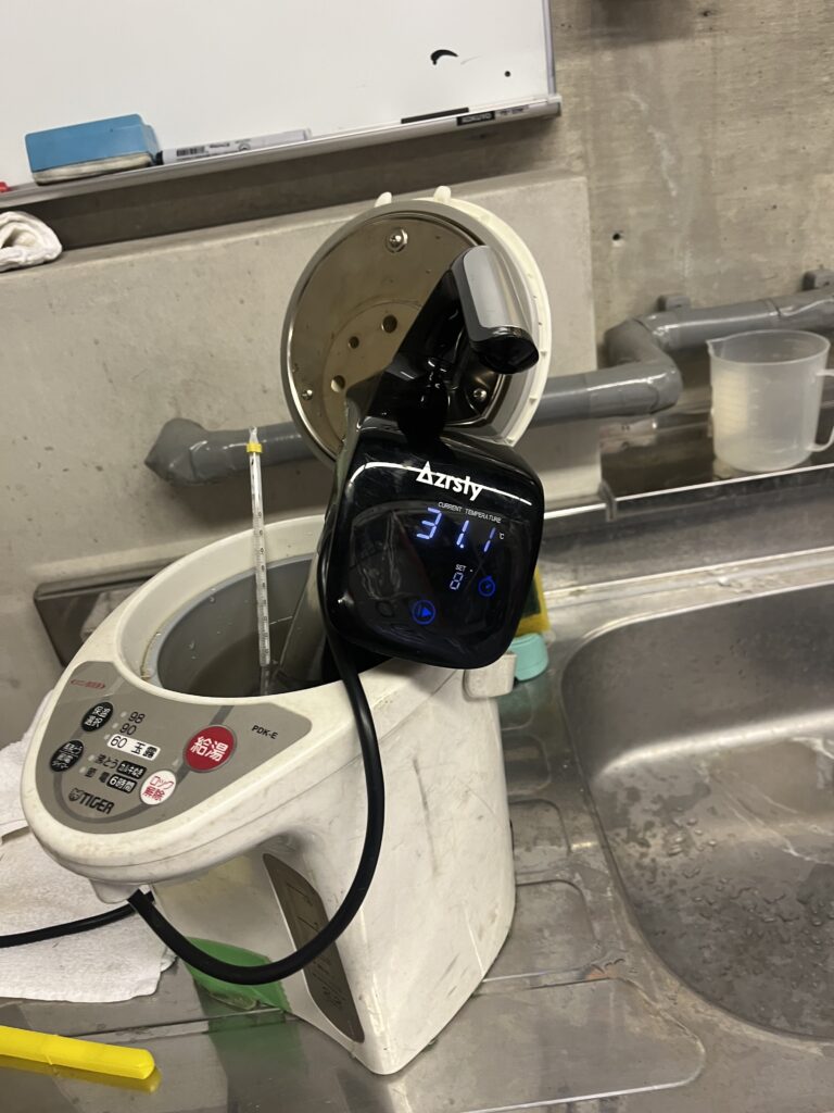 必要なものは100℃以上を確認できる棒状温度計、ポットが必要になりますが、今回温めることができ、一緒に温度も確認できるものを使わせていただいたので、その機械を使用して行いました。