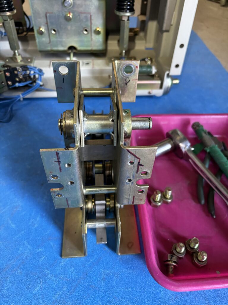 前回おこなった時も苦戦した、リンクフレームの取り付けのところで、今回も苦戦しました。下の復帰バネの掛かりを間違わないようにしながら、引き外しの状態で保持しながらボルトを締め付けるのですが、この両方を行いながら取り付けるというのがとても難しかったです。