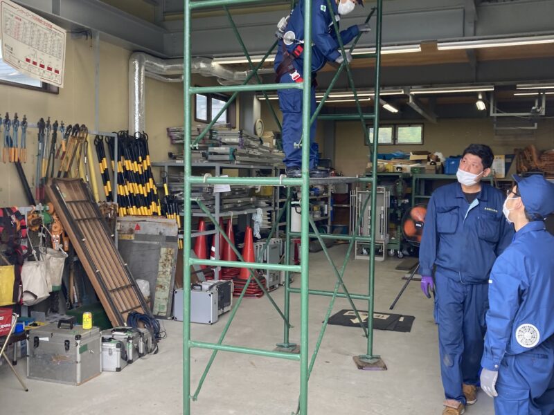 その中で抜粋した下の写真は、御社の仕事の中で変電所内のRy盤取替等で必須になるケーブル布設・端末作業の風景と、足場組立です。