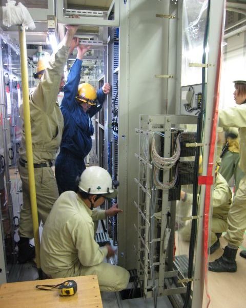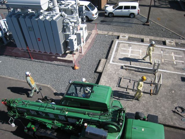 沖之島変電所の建屋の天井は意外に低く、照明もフレームのすぐ上にあるので監督が、注意深く上部を確認しながら作業を進めます。