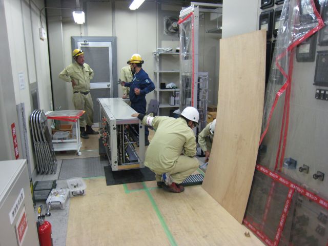 天井には照明、横には運転中の保護盤、通信盤があるため、ぶつけないように慎重に行います。