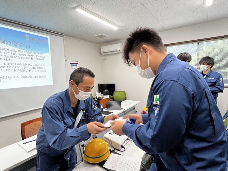 営業に行くということで、事前に愛知電機様の会社概要を学び、名刺交換の練習を行いました。