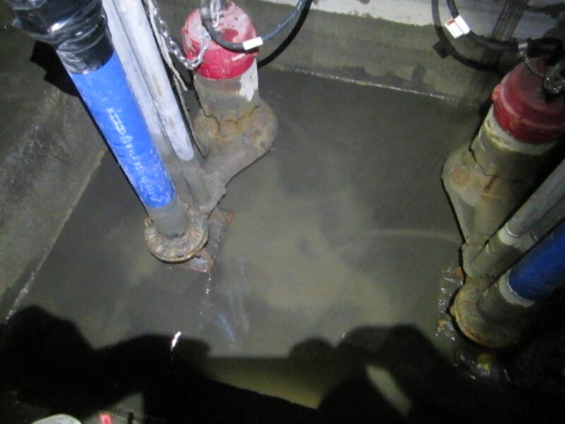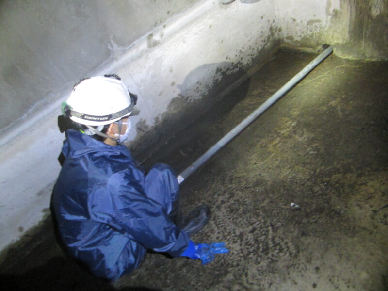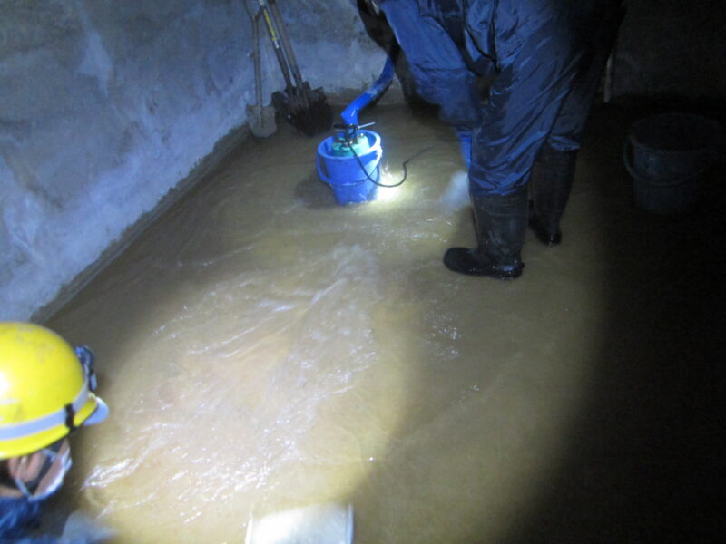 普段はその湧き出た水を湧水槽に貯め、排水ポンプにて排水していますが、どうしても汚れが溜まってしまい、それによって地下内をめぐる湧水槽が詰まってしまい、排水ポンプの場所まで水が行き届かなくなり、極端に言えば湧水が変電所内にあふれてしまいます。