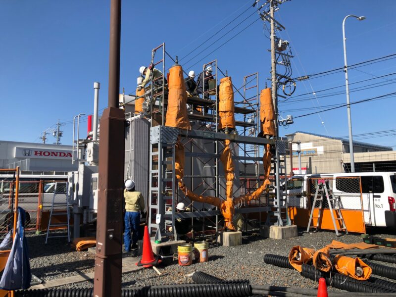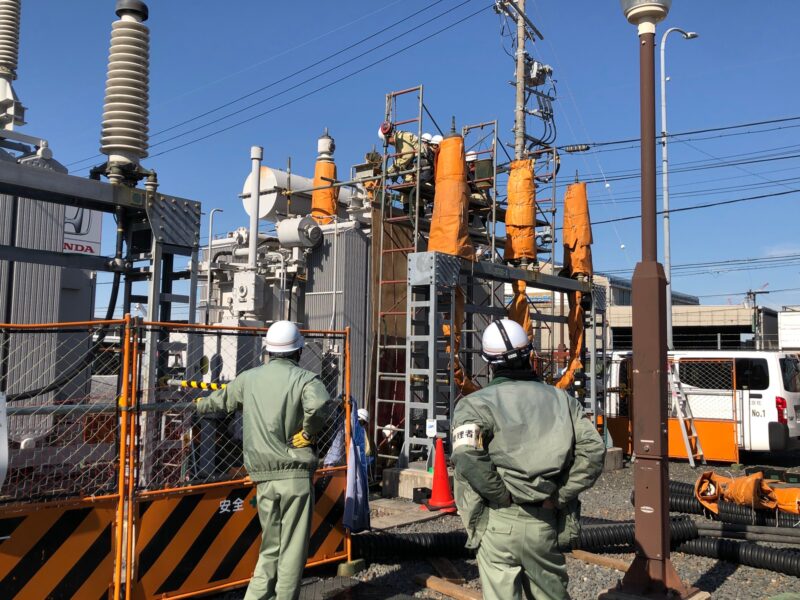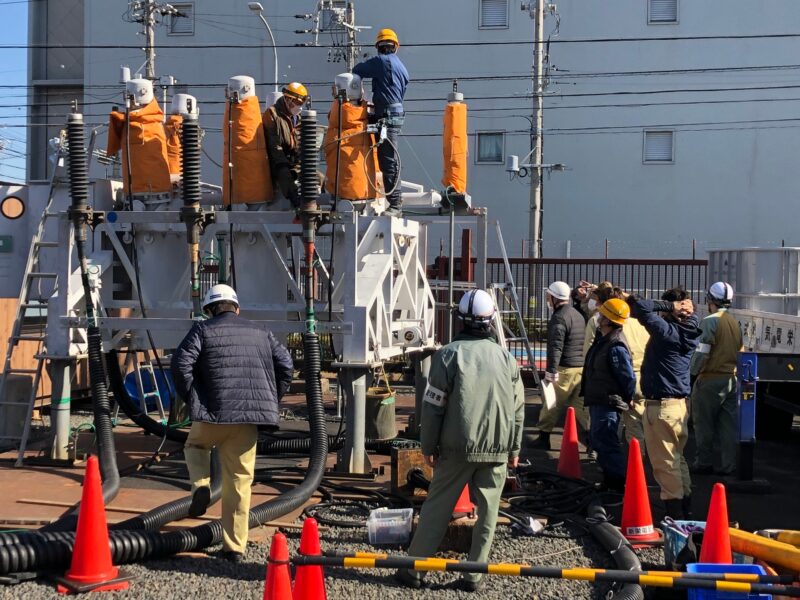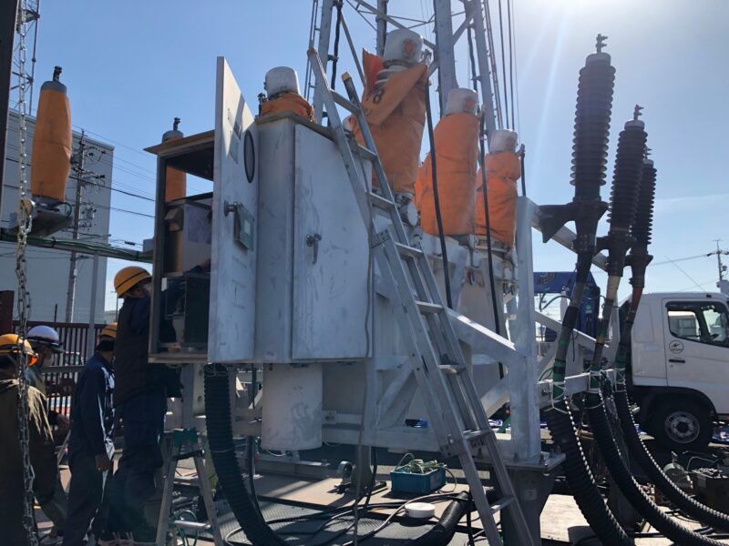 中部電力さんや他会社の方々と話し合い、無事に設置、この移動用遮断器も据付点検を行い、異常なしを確認して、送電できました。